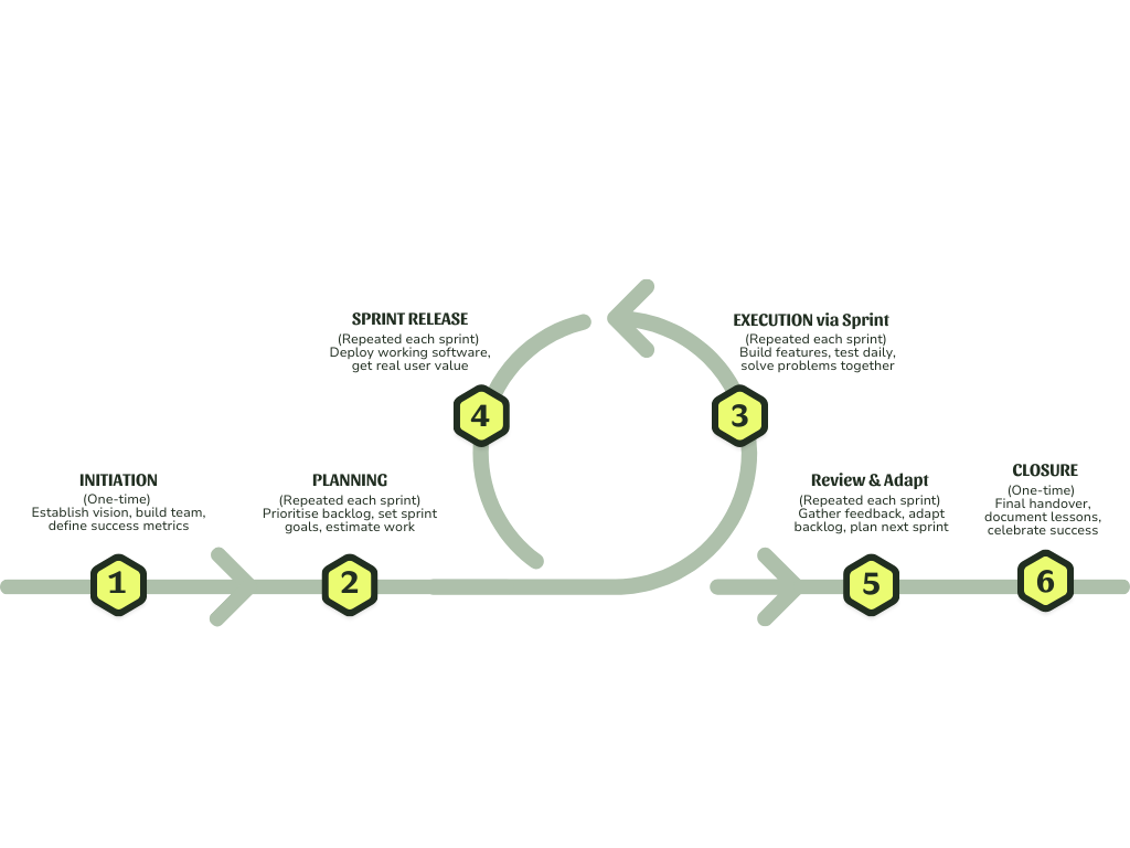 There's no "big bang" release. Each cycle delivers something usable, learns from real users, and adapts the plan based on what you discover. The magic happens in the execution phase through these repeated sprints.