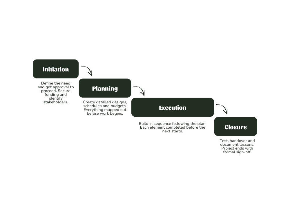 Best for: Fixed requirements, physical builds, regulated environments where change is expensive or dangerous.